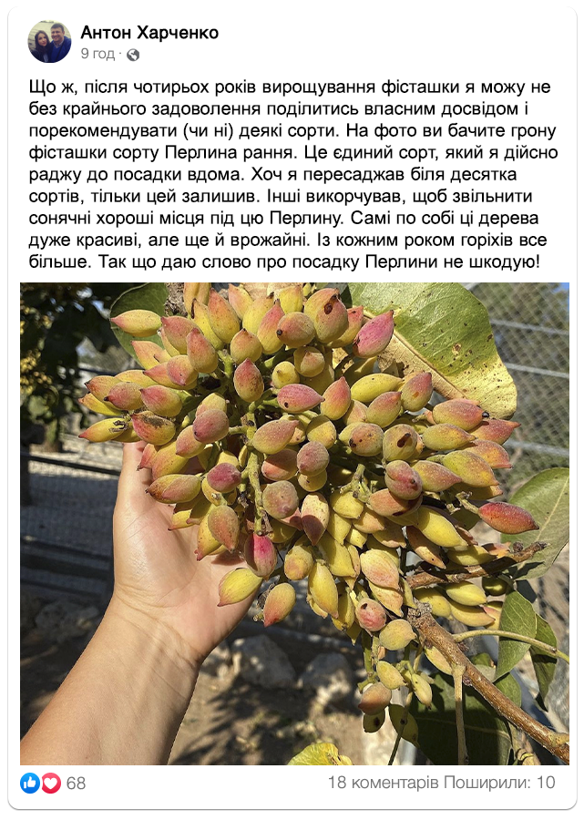 «Перлина рання» – високоврожайний та найбільший за розміром сорт фісташок, створений агрономами розплідника «EazyNut» Валентиною та Михайлом Турченко.