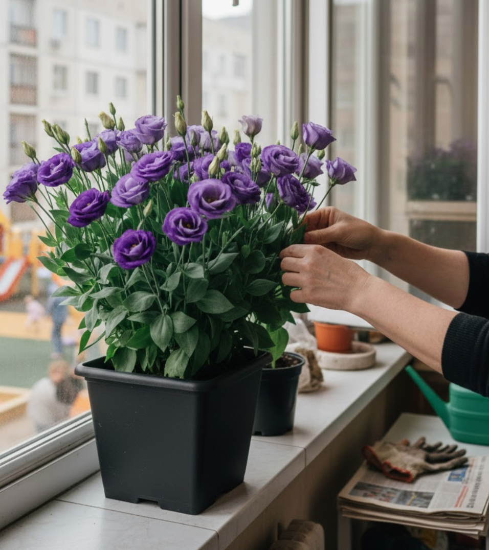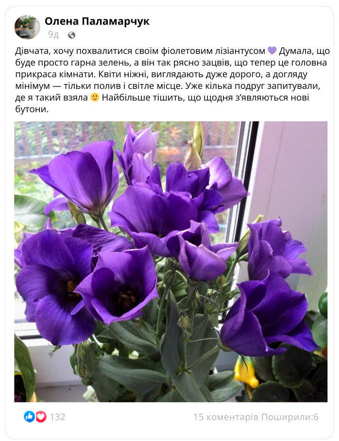 Для успішного росту ставте рослину на світле місце, поливайте помірно, не допускаючи застою води, і регулярно провітрюйте кімнату. Лізіантус любить помірну температуру та не потребує складного догляду.