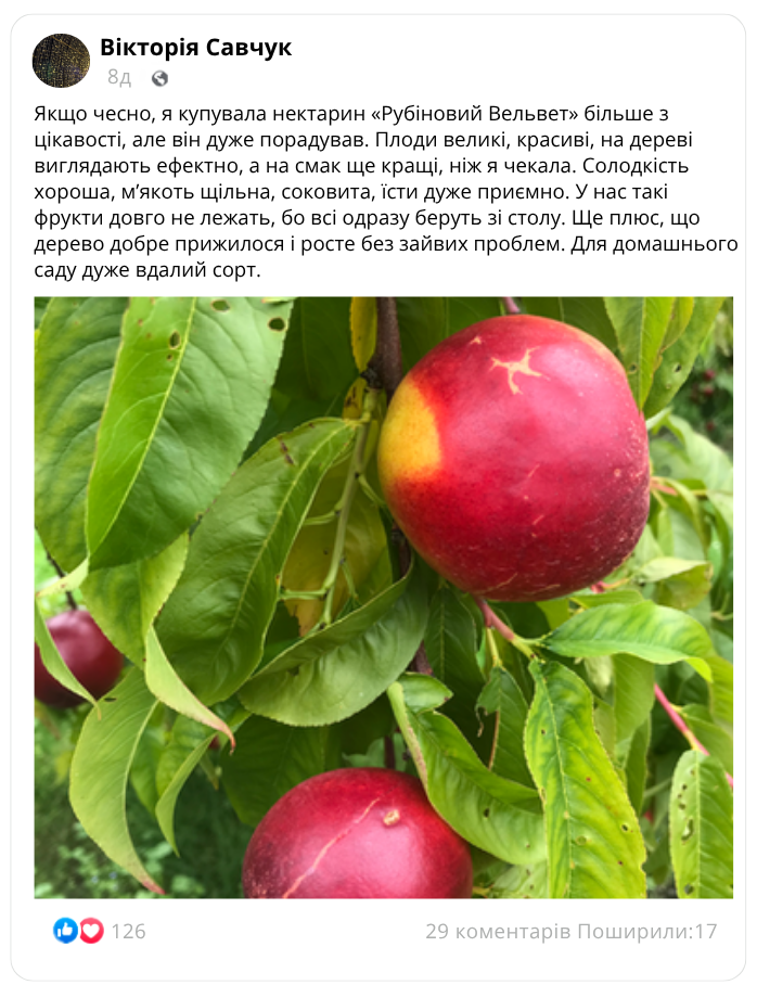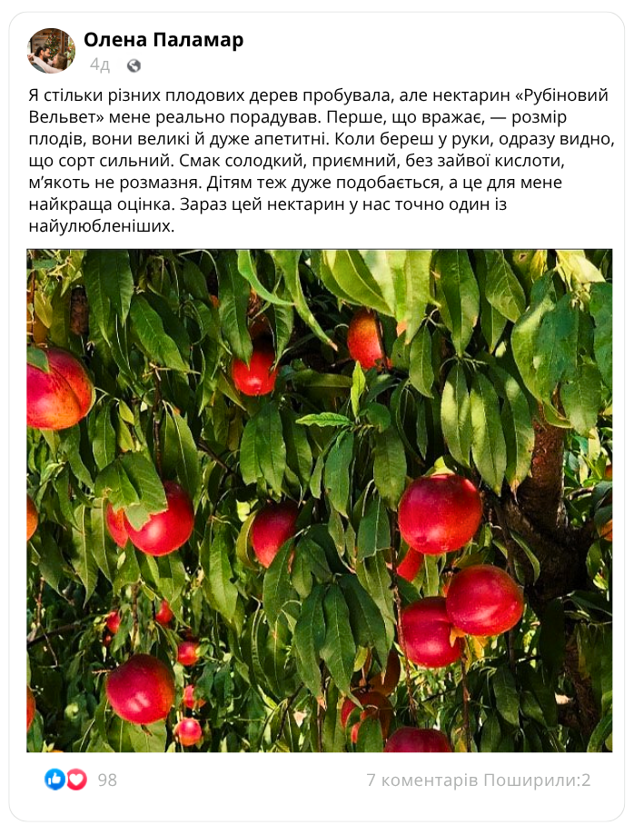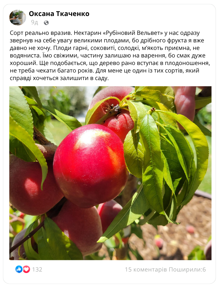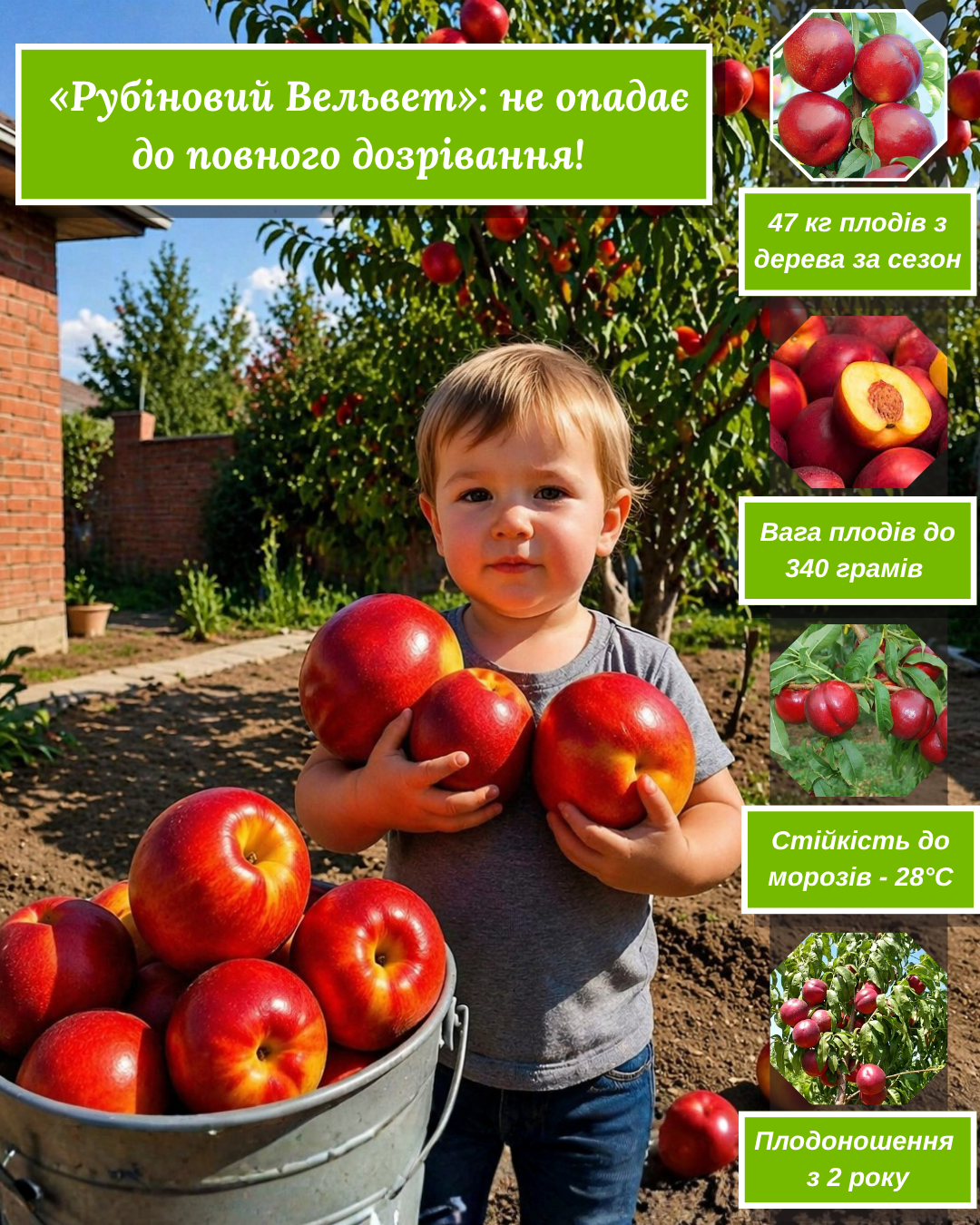 Нектарин «Рубіновий Вельвет» — це великоплідний сорт десертного типу, який цінується за ранній вступ у плодоношення, стабільну врожайність і високі товарні якості плодів.